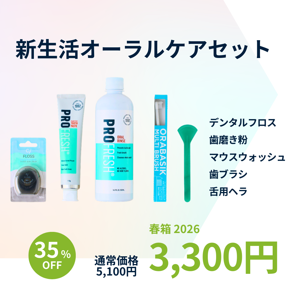 超お買い得♪ アルファネットで一番人気の本格派口臭ケアブランド「プロフレッシュ」が勢揃い!これがあれば口臭も怖くない、ベストセラー商品の「オーラルリンス」とニオイの元に吸着する成分が入った「トゥースペースト」、舌の汚れをしっかり掻き出す「タングスクレーパー」が入っています。さらにタフトブラシとミニブラシが一体となった「マルチブラシ」、歯ブラシでは取りきれない歯間の汚れを取除く「Ciフロス」がセットになった春箱!
